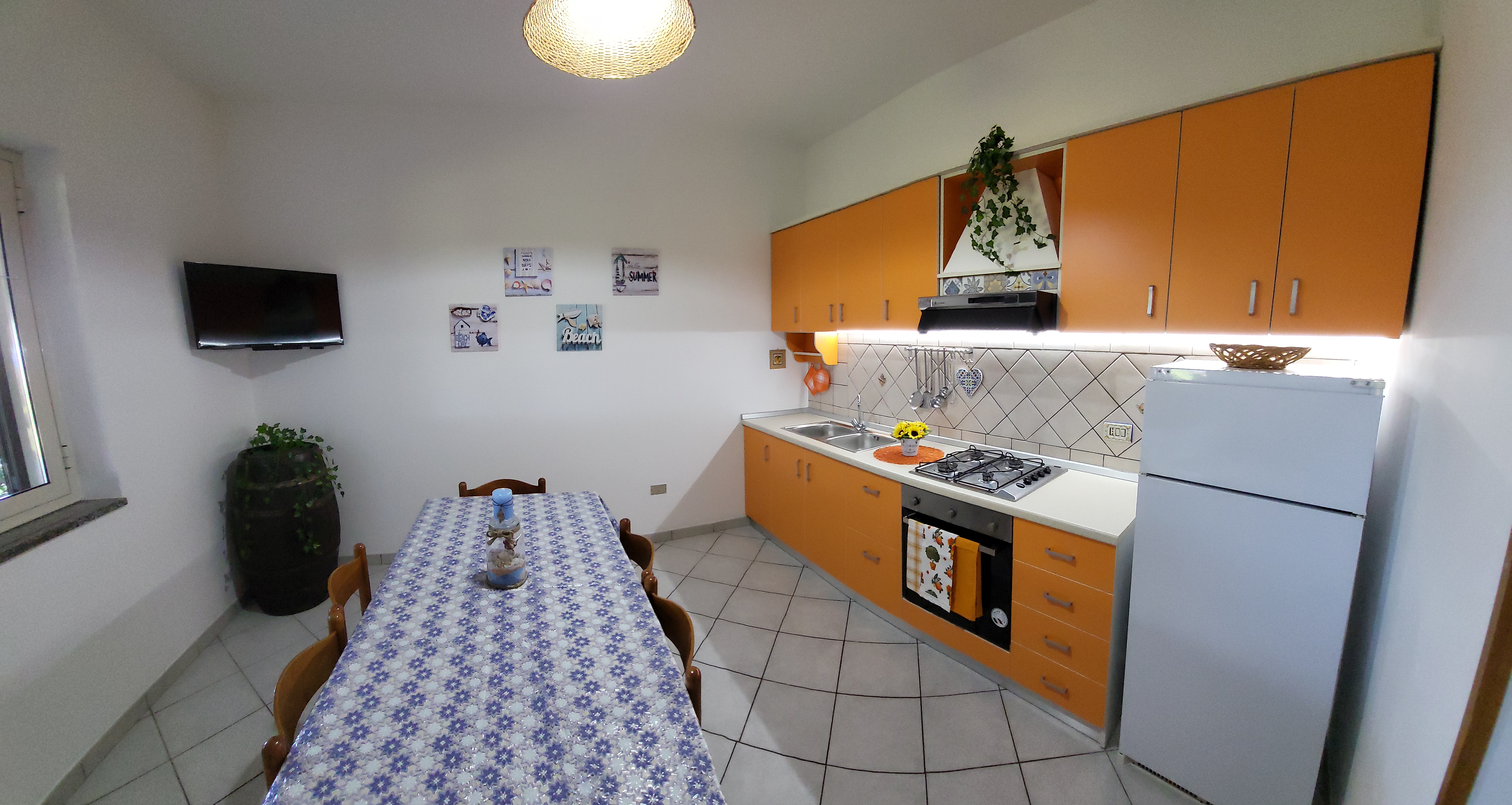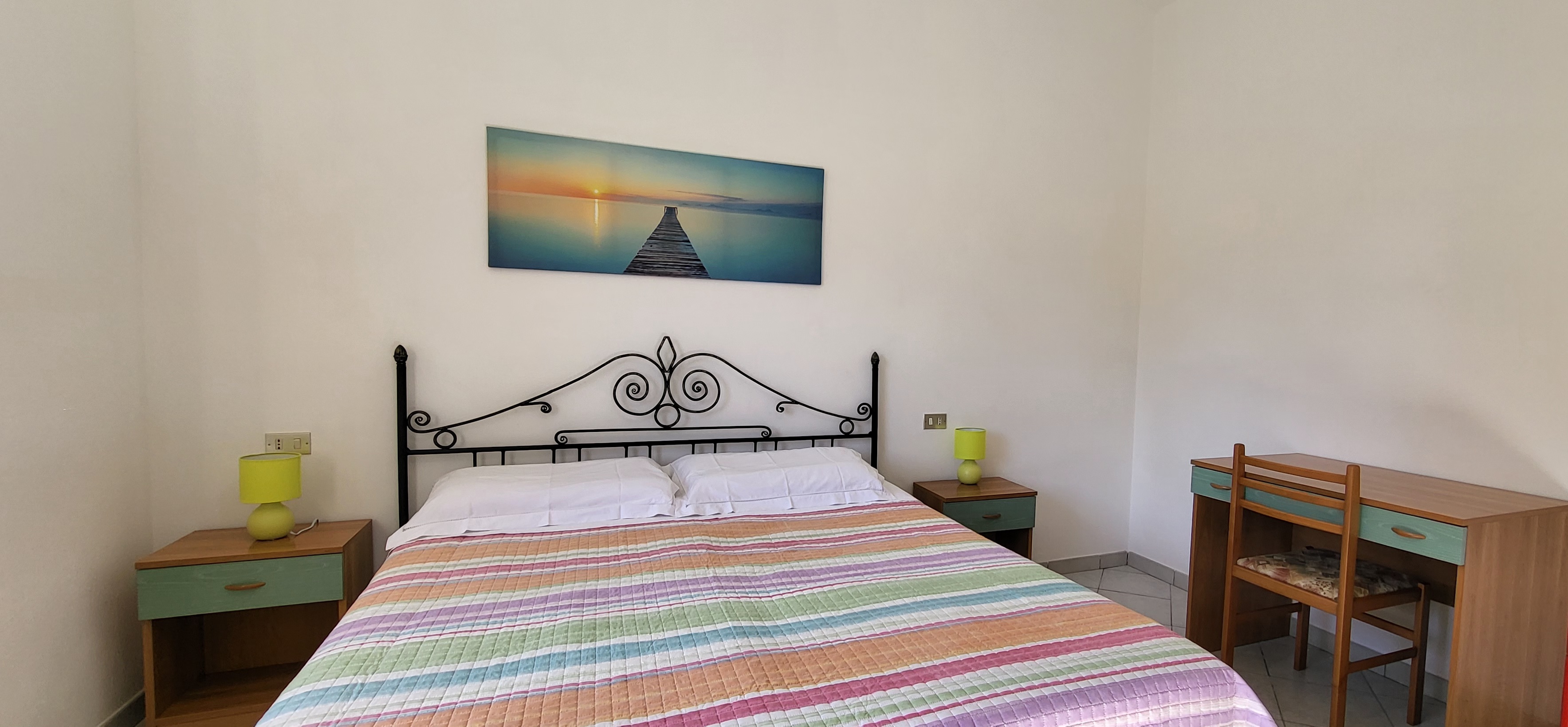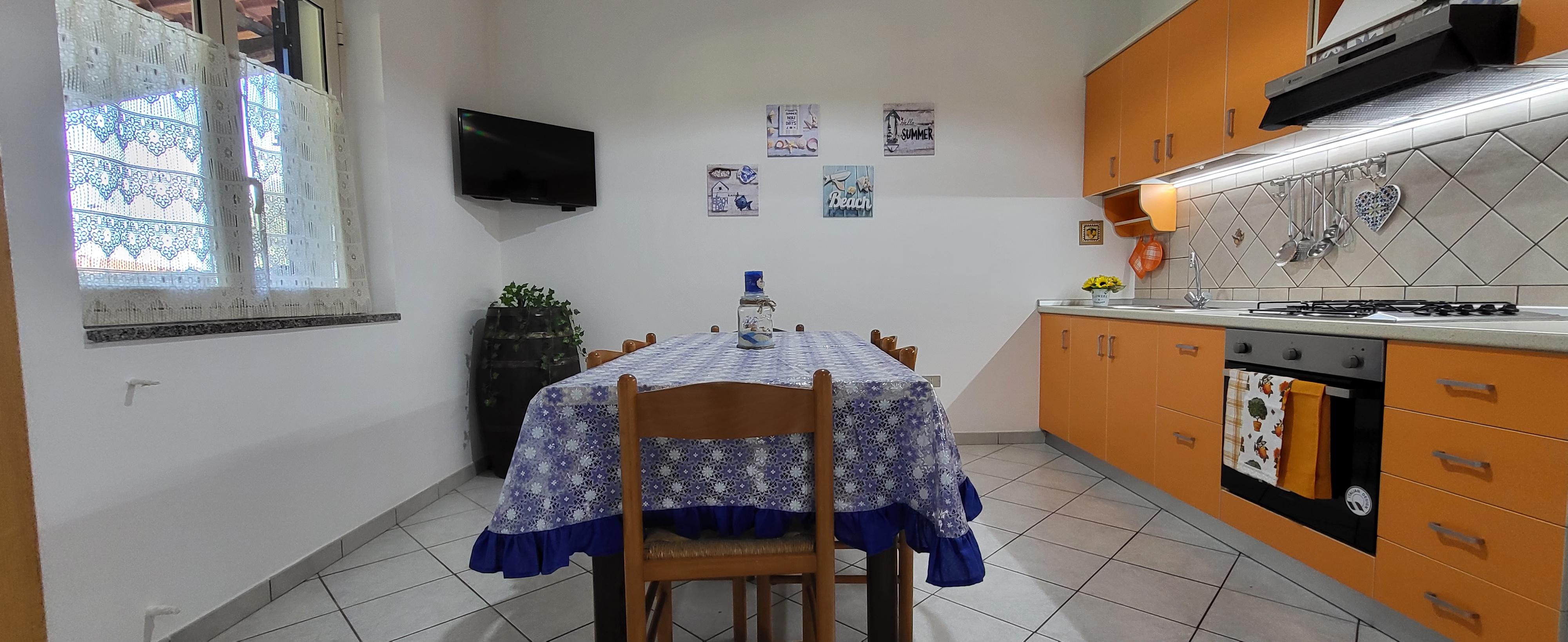 Situato al piano terra. L’appartamento è composto da 2 camere da letto con letto matrimoniale, cucina-soggiorno, bagno con doccia, ripostiglio e ampia veranda vista mare con barbecue privato. appartamento dotato di aria condizionata. Capienza max. 5 persone.
