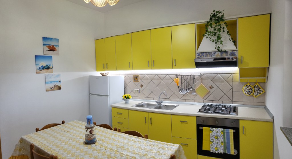 Situato al primo piano. L’appartamento è composto da 2 camere da letto di cui una matrimoniale, cucina-soggiorno con divano letto, bagno con doccia, ripostiglio, balcone vista mare e un ampia veranda con barbecue privato. Appartamento dotato di aria condizionata, macchina del caffè. Capienza max. 6 persone.